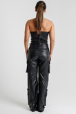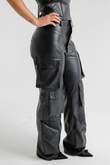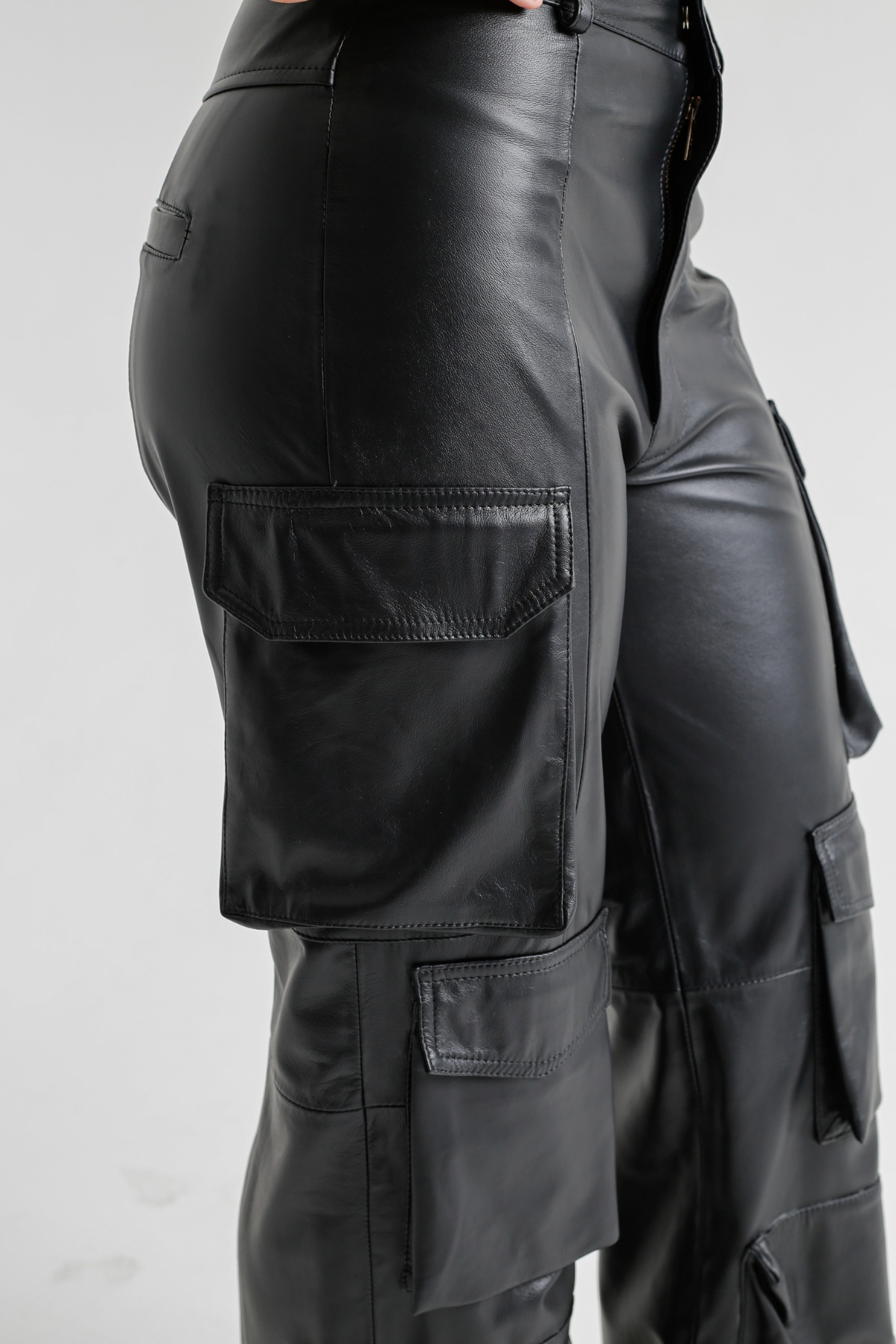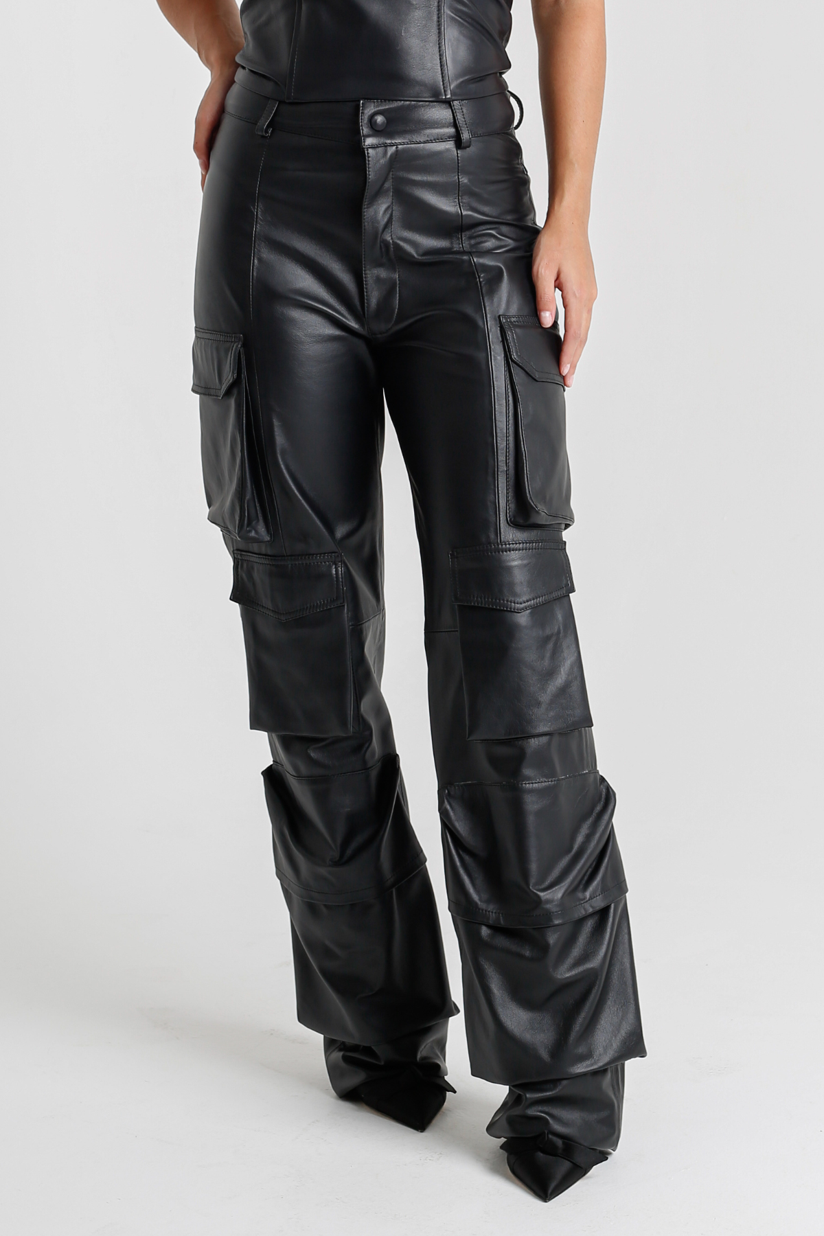 Leather pants with a flared design and fringes that run from the back to the front of the hem.