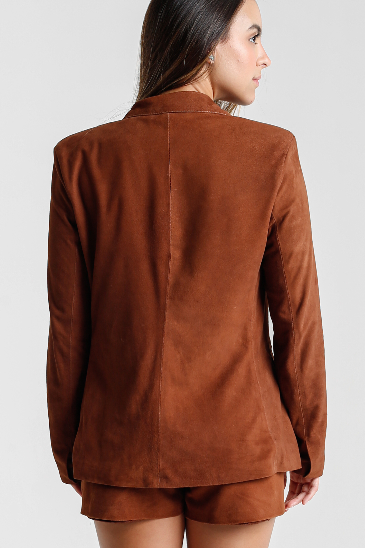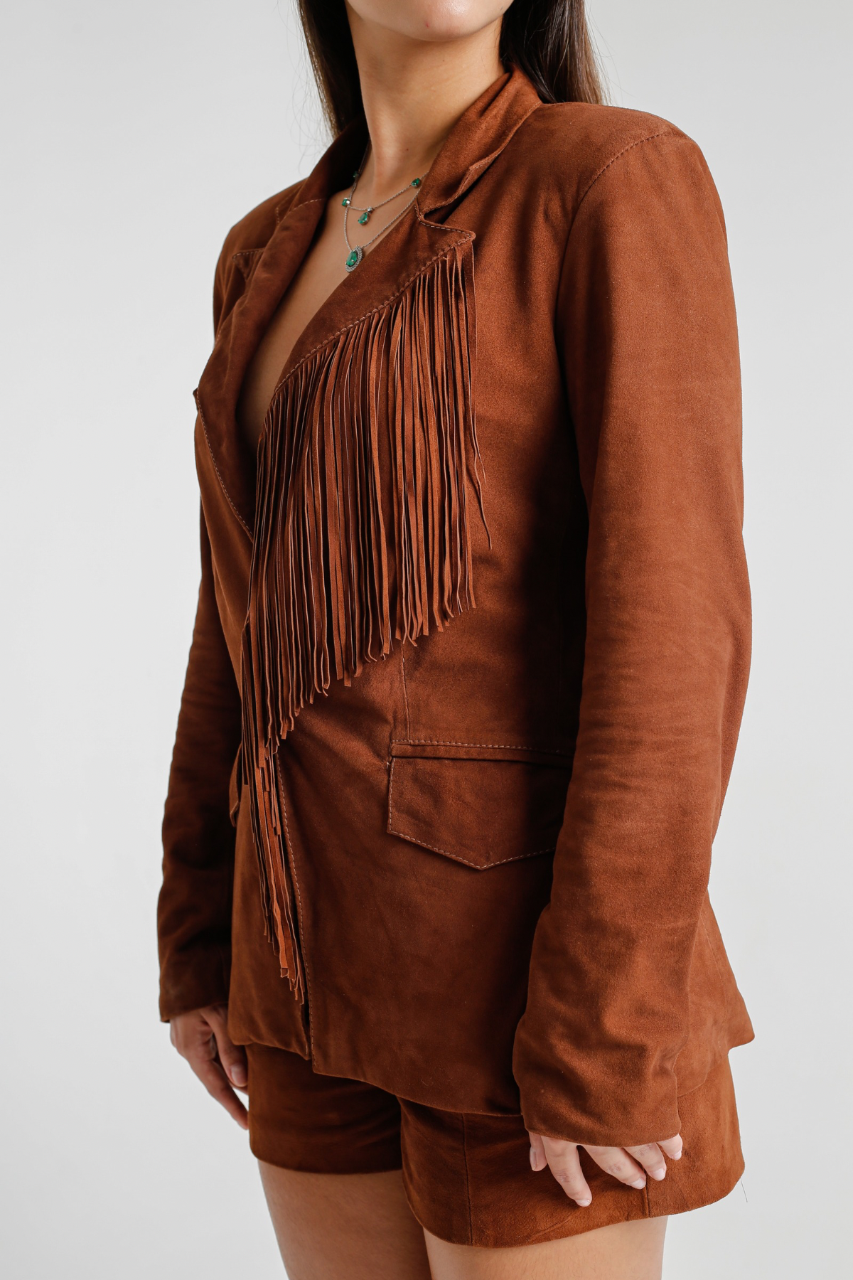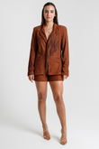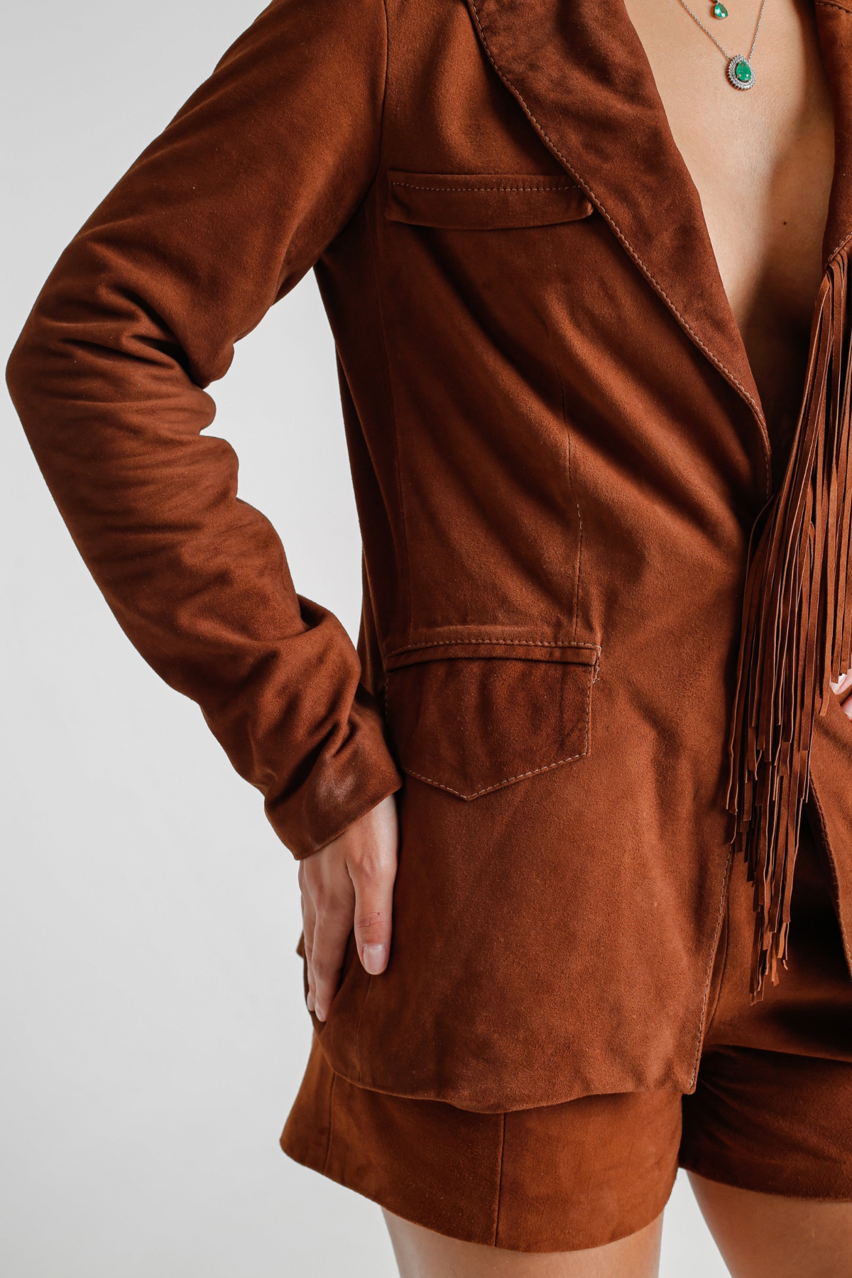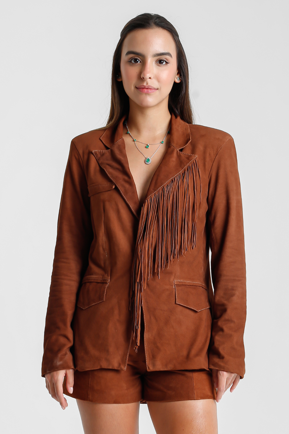 Blazer com franjas na lapela, em couro chamoi, acabamento macio e aveludado.