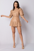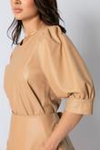 Blusa em couro com mangas bufantes, punhos com fechamento de botões de pressão encapados em couro da mesma cor que a peça.