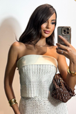 Blusa em Couro Pelica, modelagem sem alças, em couro cortado à laser com trabalho manual de tricô, com forro curto em couro liso .