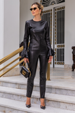 Possui babados nos punhos e corpo com detalhe pespontado.