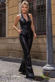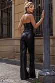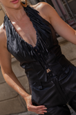 Blusa de Couro Pelica, com modelagem frente única, com franjas no decote da frente, e detalhe trançado .