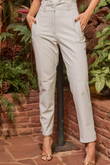 Calça em couro, com modelagem ajustada ao corpo, com bolsos laterais que fecham com zíper de metal.