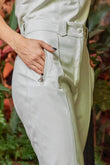 A calça possui braguilha e cós médio que fecha com botão encapado e zíper de metal.