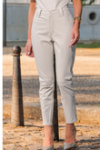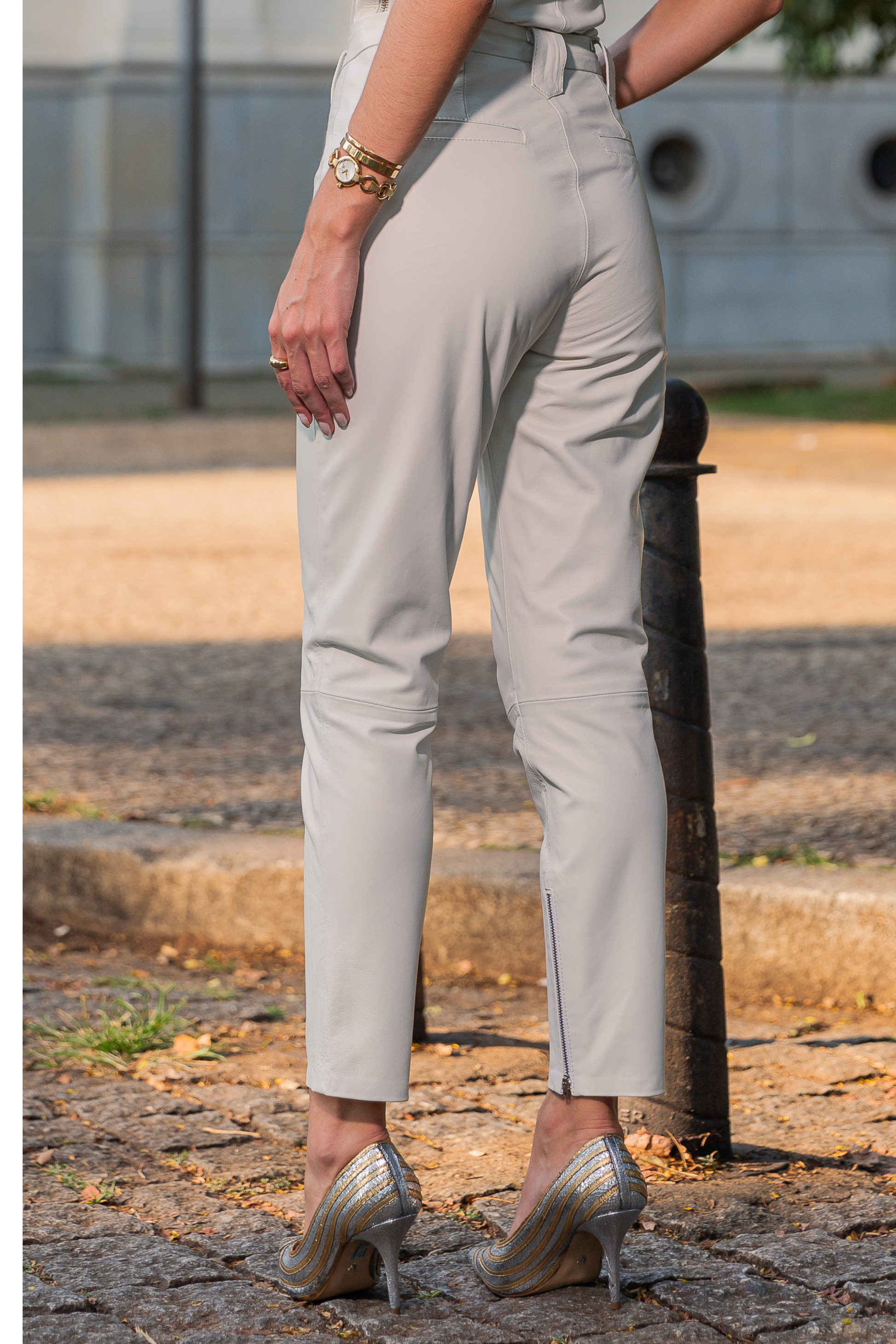 Fechamento em braguilha e botão de pressão encapado em couro da mesma cor da peça.