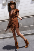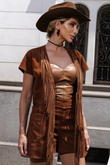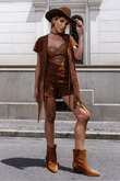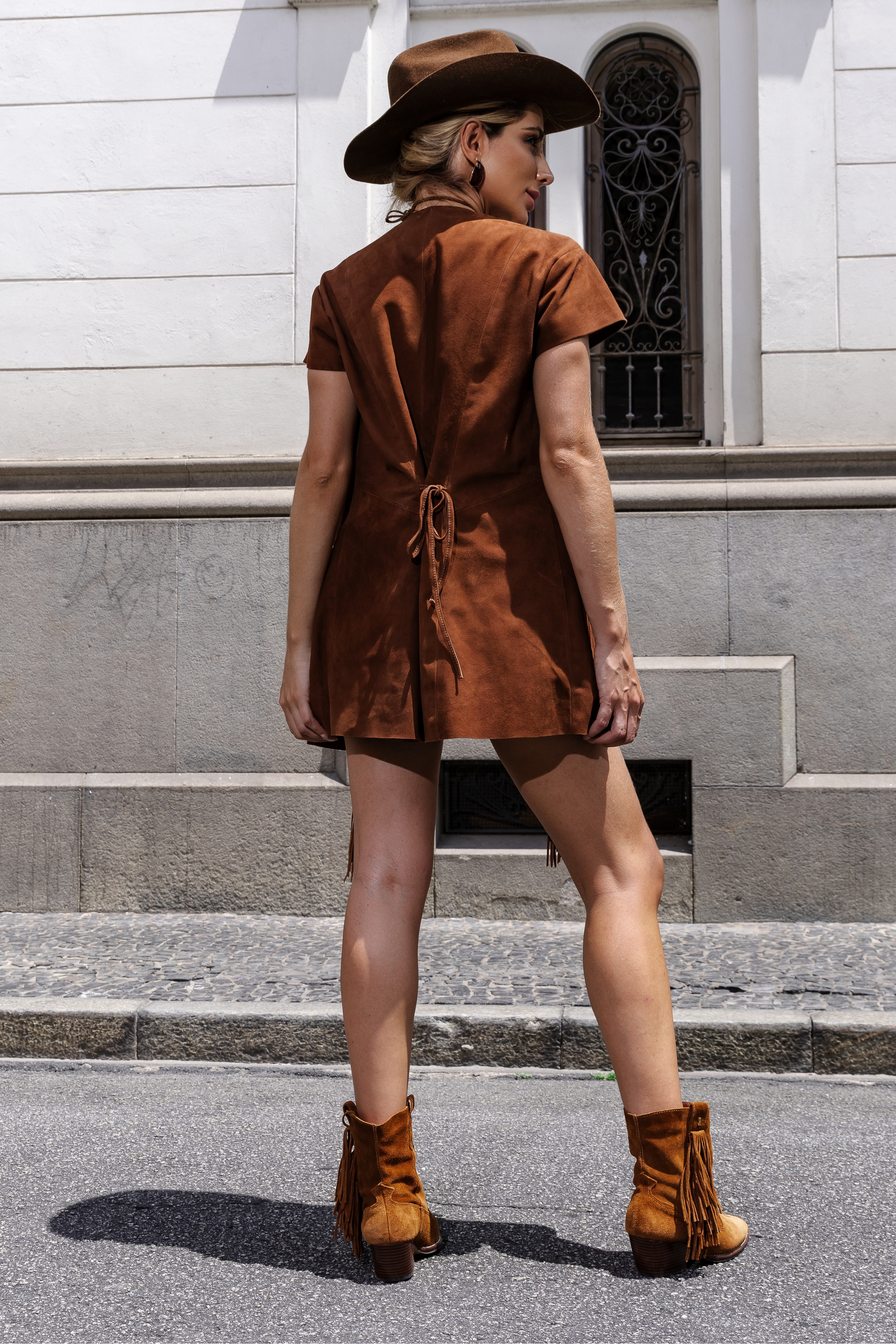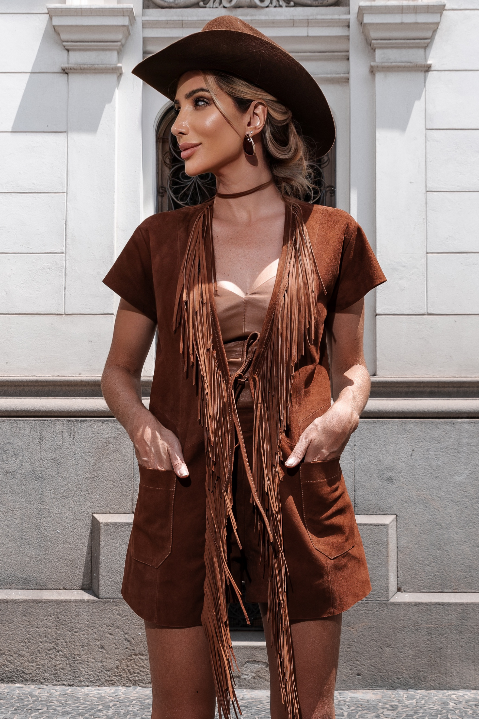 Colete amplo, em couro camurça com franjas por todo o decote.