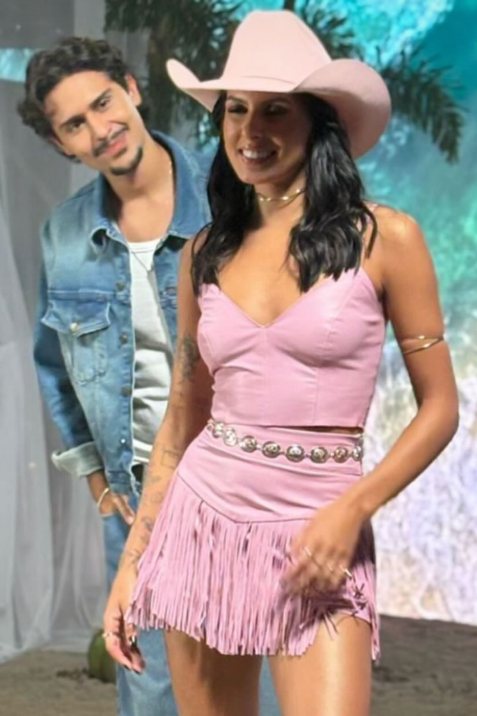 Regata cropped com alças finas em couro, decote V, recortes frontais e fechamento nas costas com zíper de metal destacável.