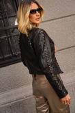 Jaqueta de Couro Pelica com aplicação de tachas em metal, conferindo ainda mais charme a peça.