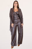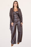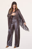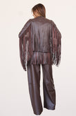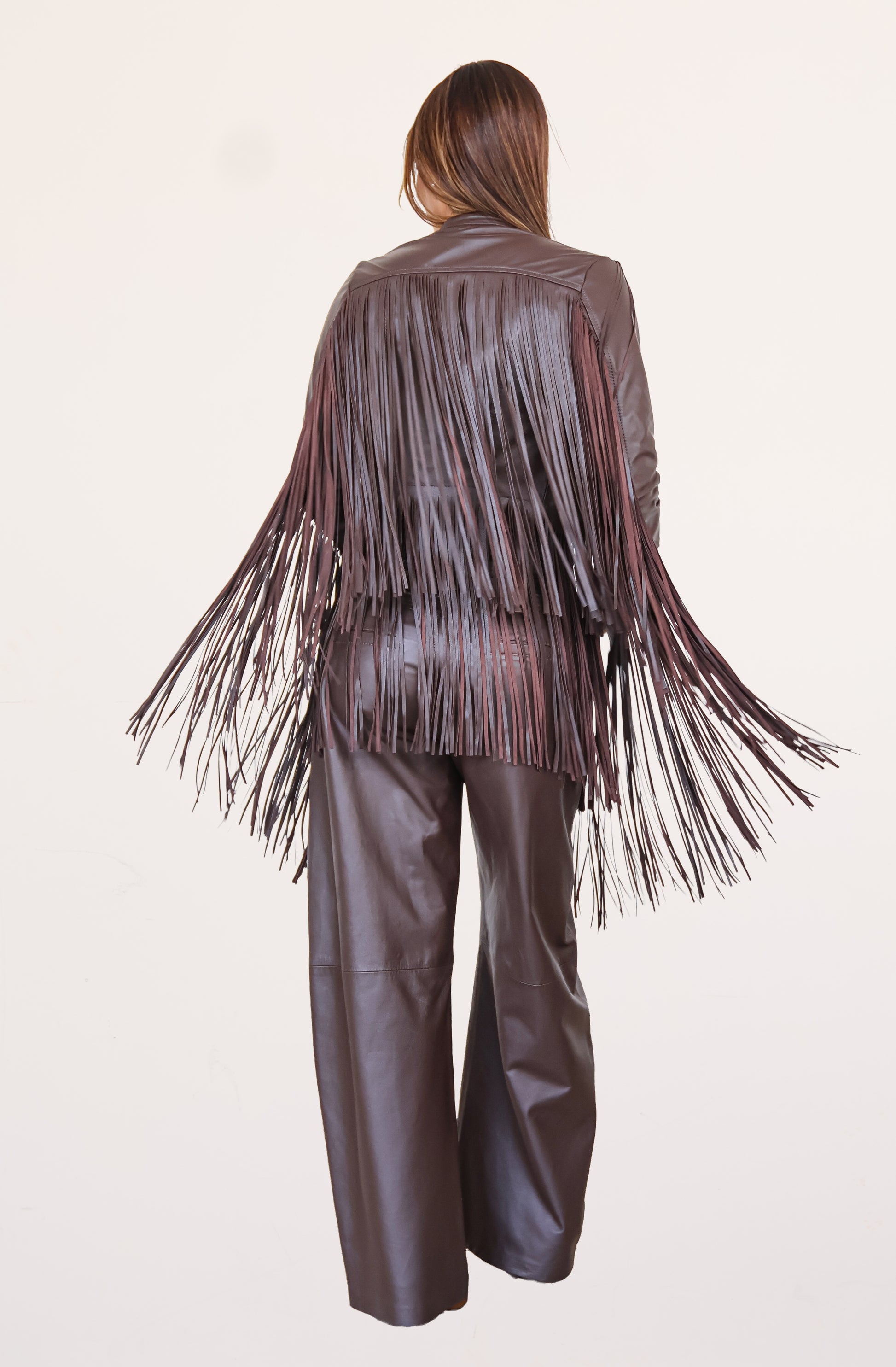 Jaqueta de couro modelagem Perfecto, com franjas nas costas, na barra e nas mangas.