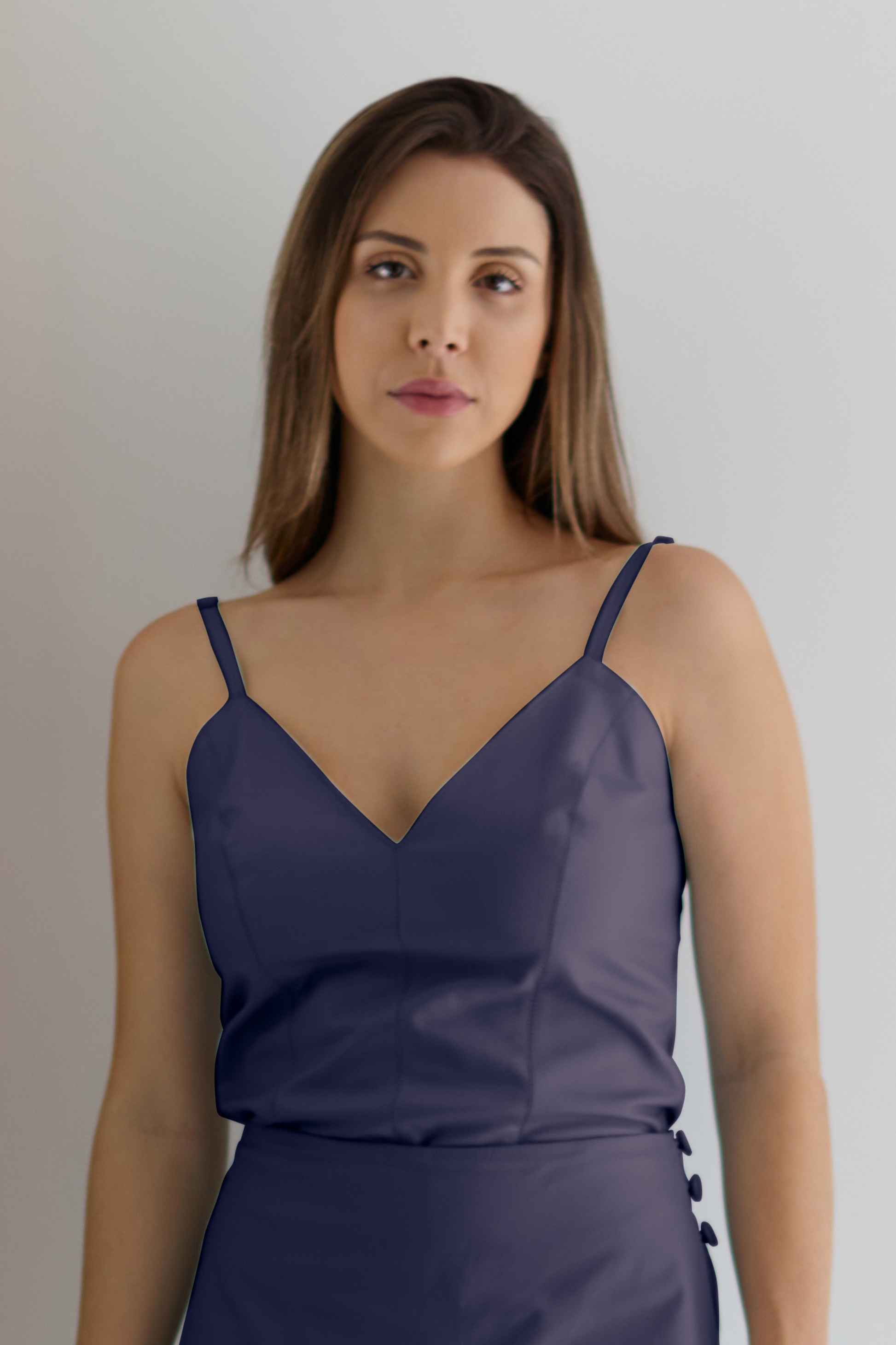 Regata básica com alças finas em couro, decote V, recortes frontais e fechamento nas costas com zíper de metal destacável.