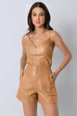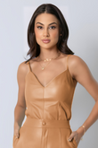 Regata básica com alças finas em couro, decote V, recortes frontais e fechamento nas costas com zíper de metal destacável.