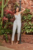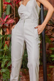 Regata básica com alças finas em couro, decote V, recortes frontais e fechamento nas costas com zíper de metal destacável.