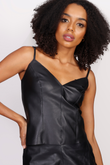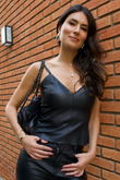 Regata básica com alças finas em couro, decote V, recortes frontais e fechamento nas costas com zíper de metal destacável.