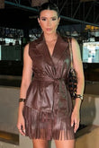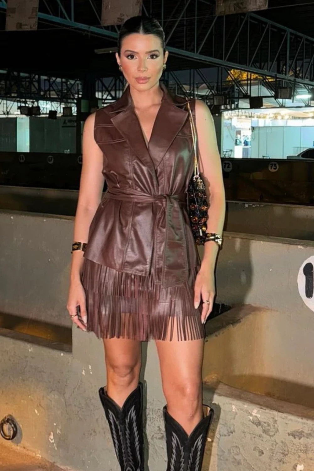 Saia midi em couro, com cós largo, modelagem reta e aplicação de franjas de couro na mesma cor da peça