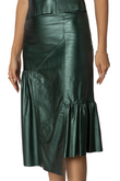 Saia midi em couro, com cós e barrados em leves babados assimétricos.
