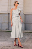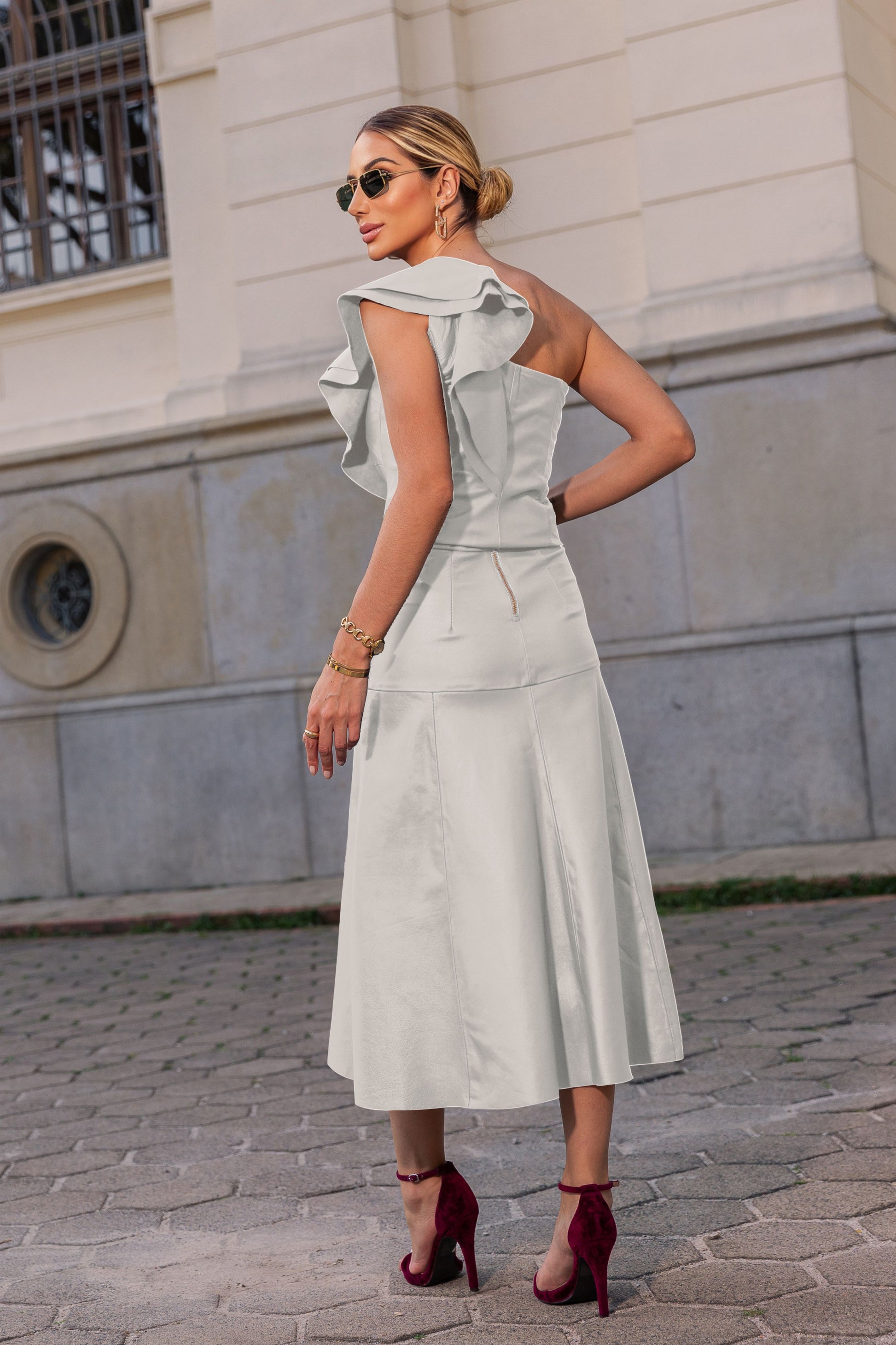 Saia midi em couro, com pala larga e bolsos falsos na frente.