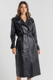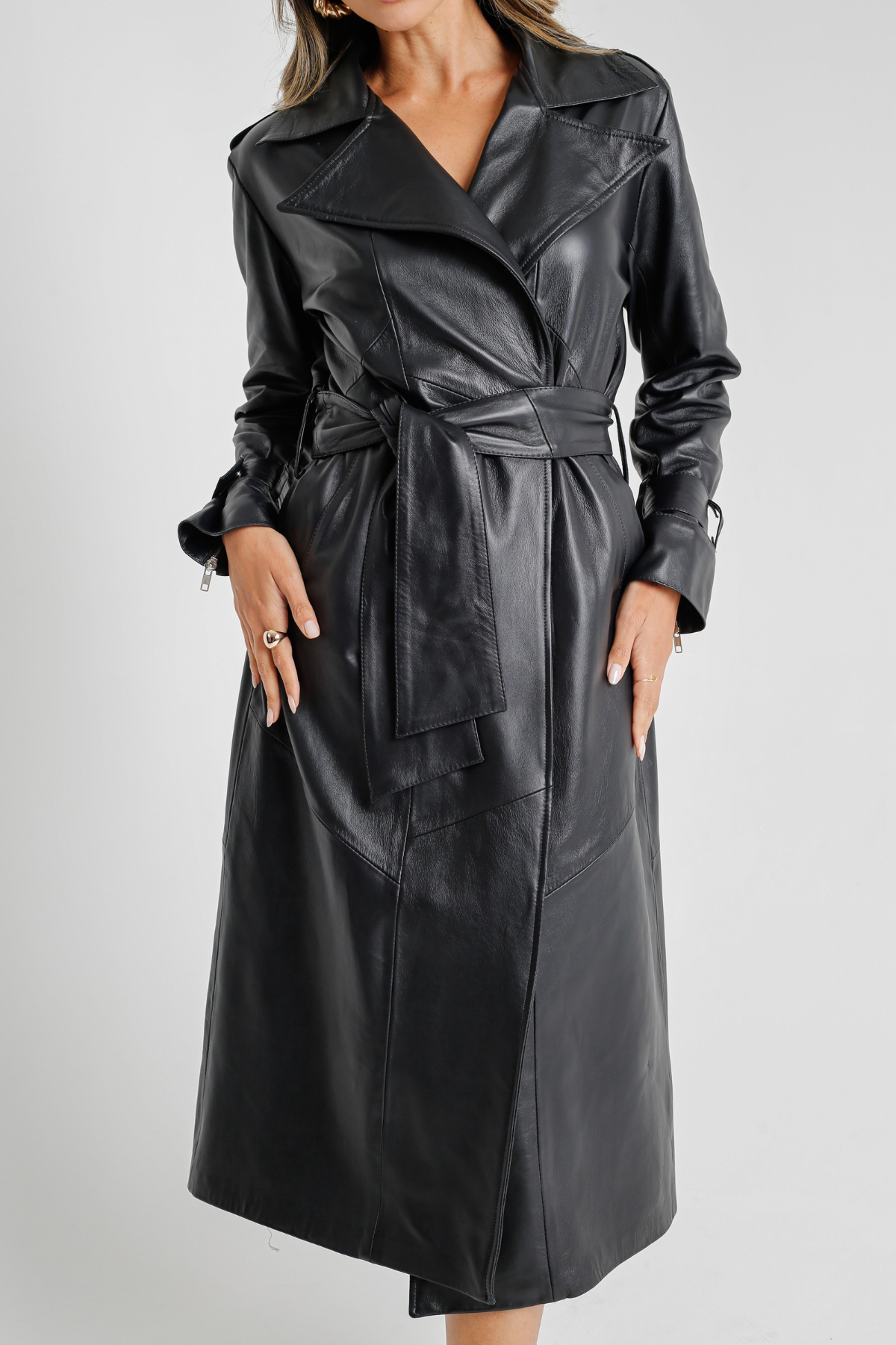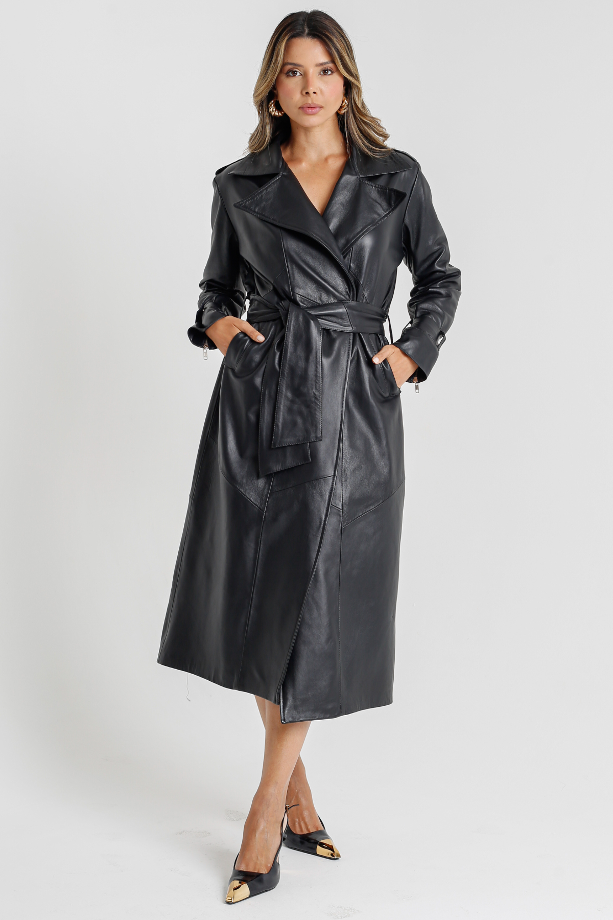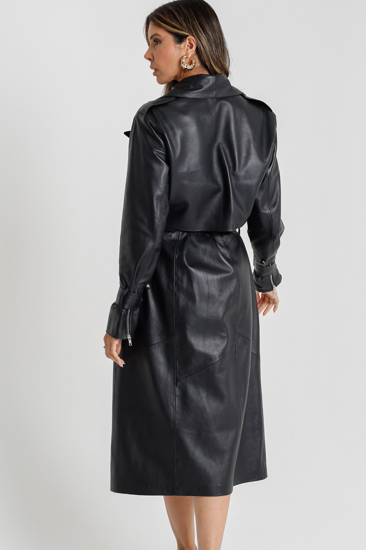 Sobretudo em couro pelica, em comprimento longo, abaixo dos joelhos.