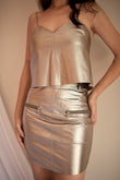 Top de alças finas em couro, com decote em V. Suas alças são ajustáveis para regular conforme a altura que você preferir e fechamento de zíper de metal destacável nas costas.