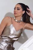 Influencer Maria Rosa Guerra, veste conjunto de top Leda e calça Camila, na cor prata velho, Tamanho PP