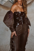 Top sem alças, estilo tomara que caia em couro, com decote reto e costas com lastex