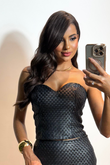 O top em couro com recortes e modelagem ajustada ao corpo, costas elásticas em lastex com fechamento nas costas com zíper de metal destacável.