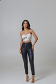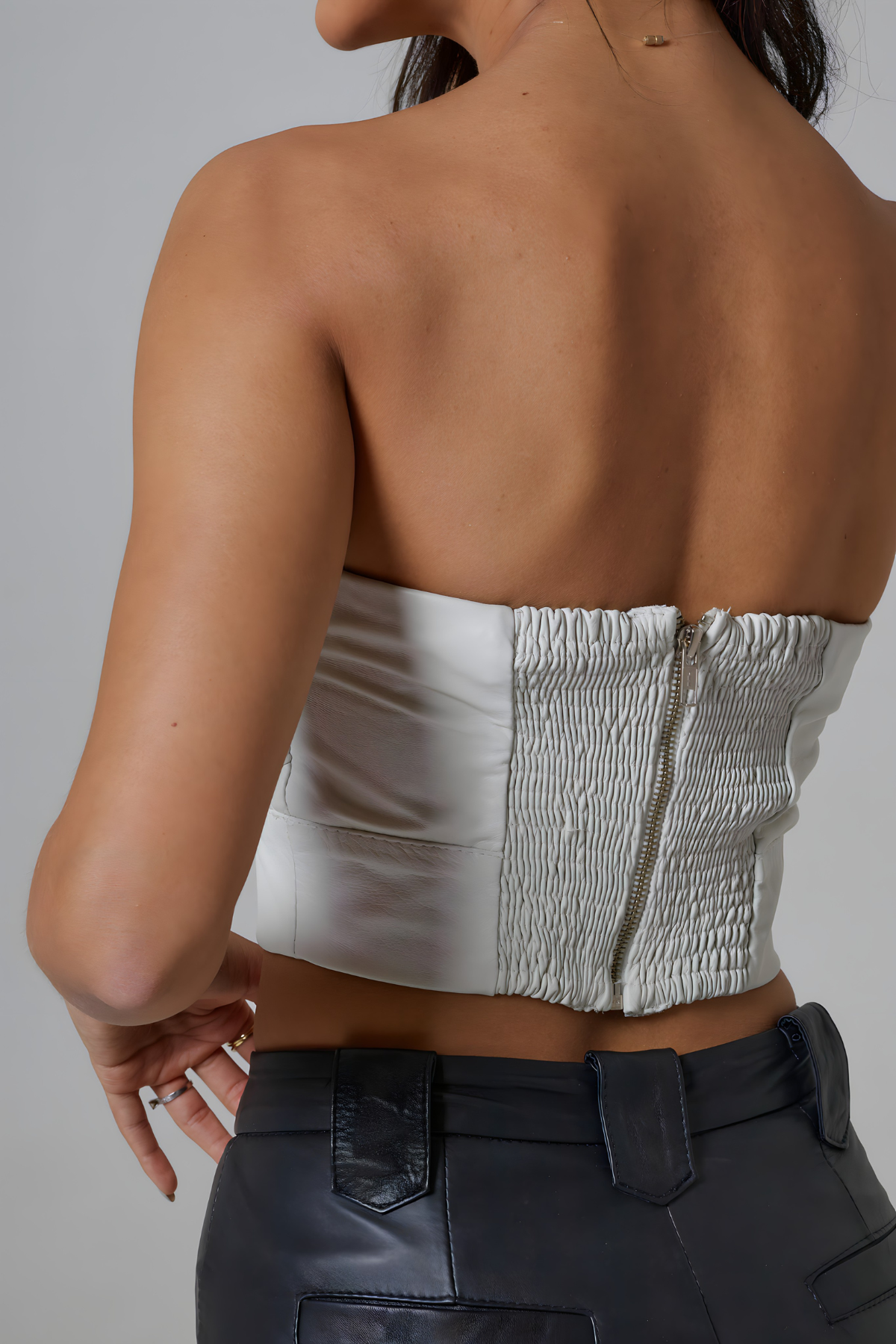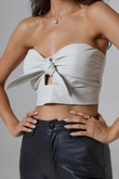 Top Cropped em couro pelica, com leve drapeado no centro do busto, que pode ser usado com ou sem laço.