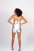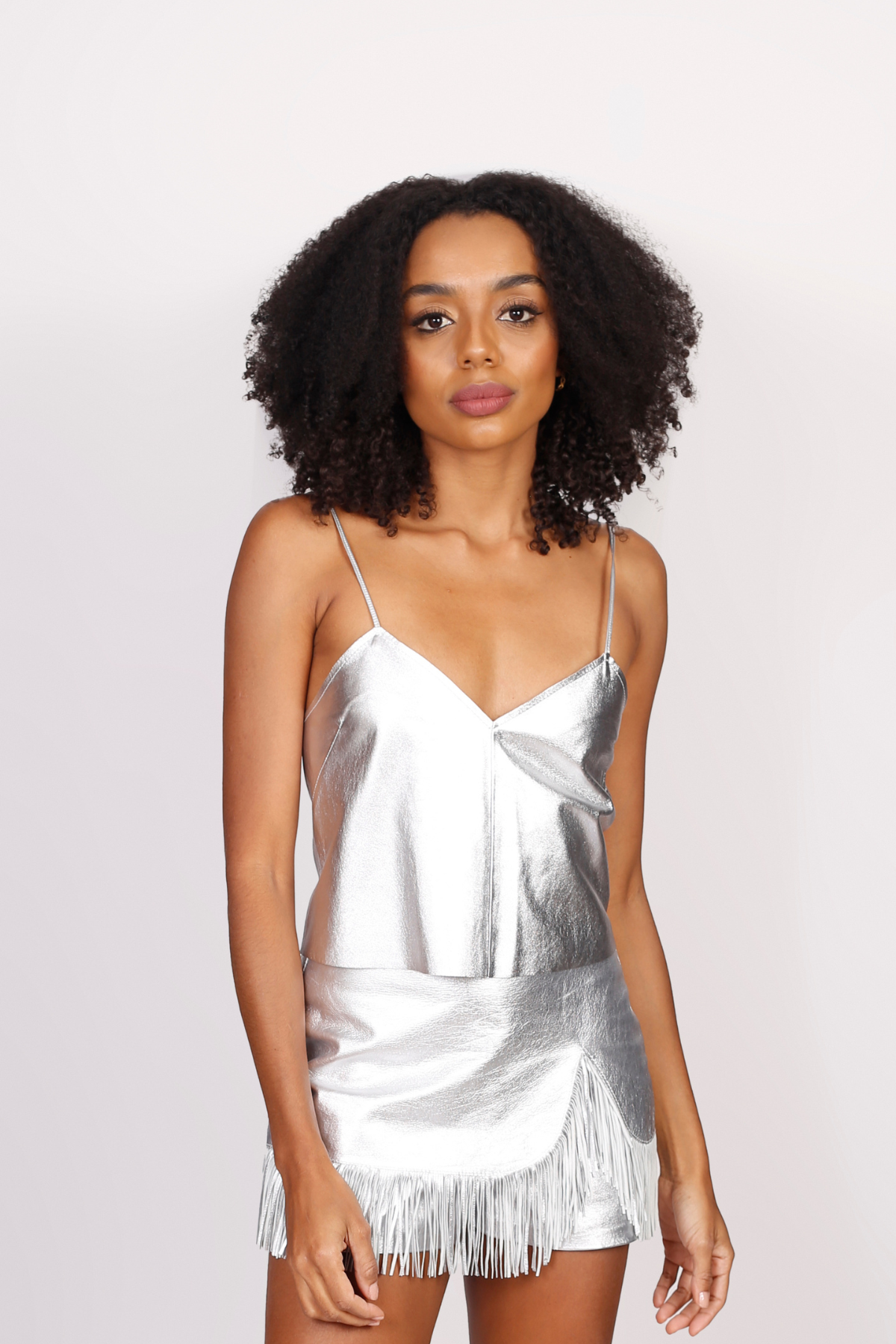 Top de alças finas em couro, com decote em V. Suas alças são ajustáveis para regular conforme a altura que você preferir e fechamento de zíper de metal destacável nas costas.