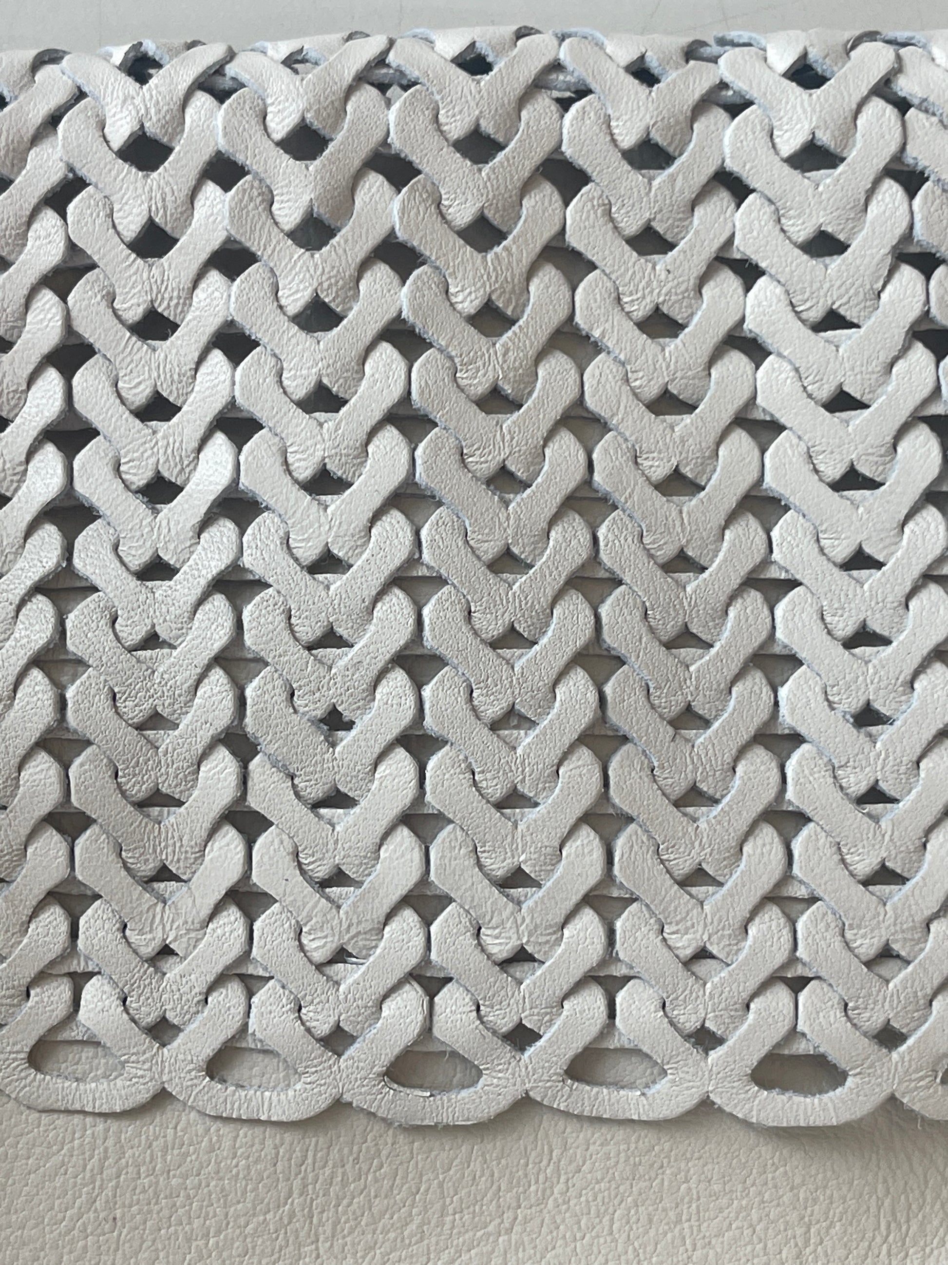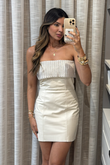 Modelagem sem alças com Debrum em tricô feito em corte à laser também em ouro pelica.