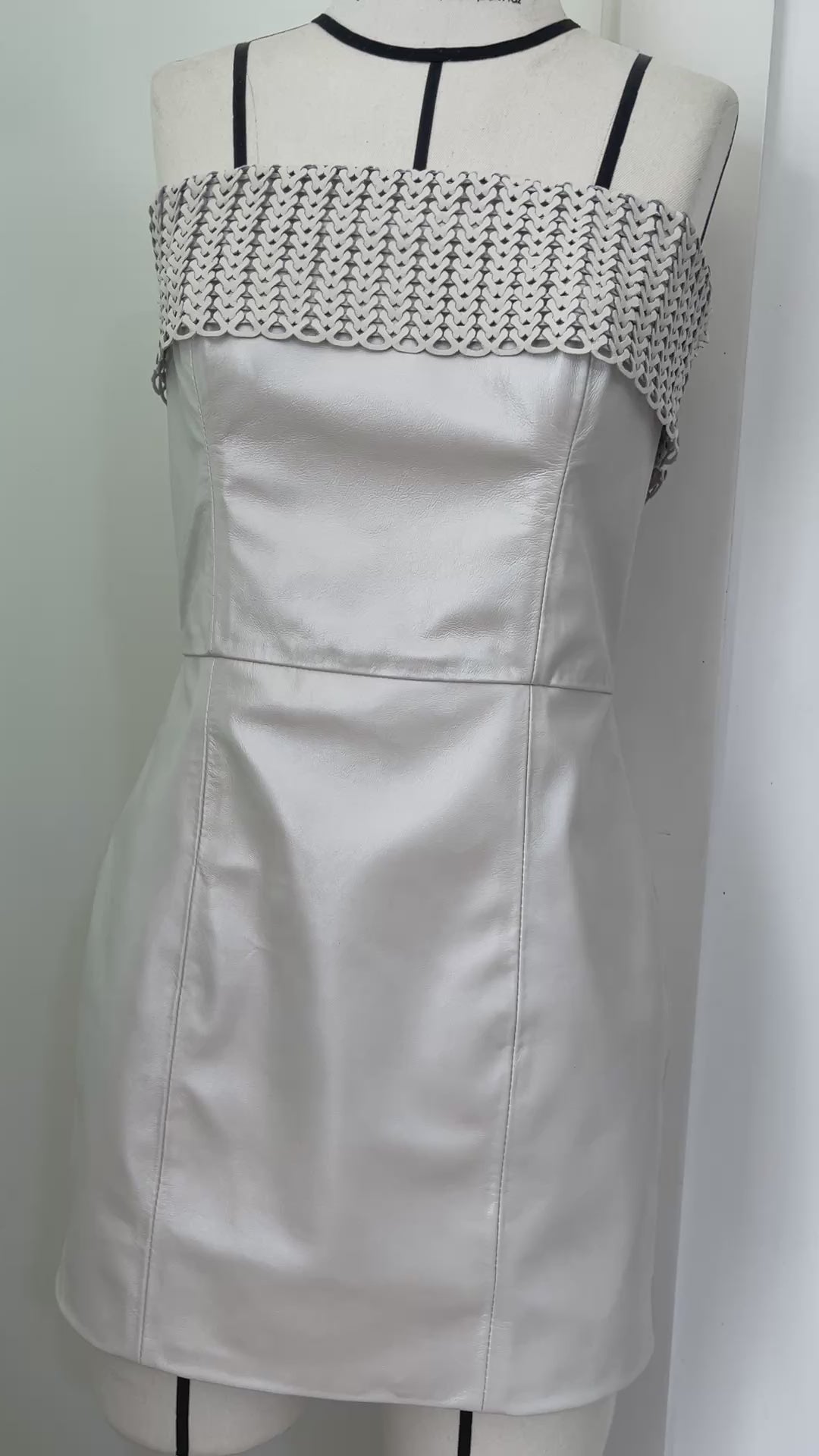 Vestido Curto Couro Pelica com modelagem tubinho, com detalhe no busto em tricô de couro.