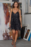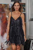 Vestido com decote V na frente e reto nas costas, modelagem ajustada ao corpo com camadas de franjas em couro sobrepondo o vestido, causando um lindo movimento.